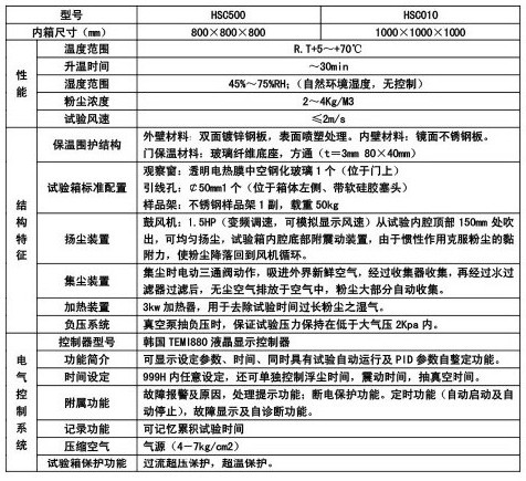 MC028系列沙塵試驗箱 一、產(chǎn)品簡介 本塵沙試驗箱主要滿足一下使用要求: 1. 防塵環(huán)境模擬試驗箱可以不受時間和季節(jié)的限制,隨時模擬自然界的典型環(huán)境條件,以模擬環(huán)境代替使用環(huán)境,可以節(jié)省大量的人力和物力,節(jié)約研制經(jīng)費。試驗具有“加速”性質,能夠縮短產(chǎn)品的試驗周期。 2. 依據(jù)用戶“防塵試驗技術要求”相關技術要求等資料編制。 3. 同時依據(jù)IEC60529-2001、GB/T4942.1-2006、GB/T4208-2008、GB 7001等相關標準。 二、技術參數(shù):